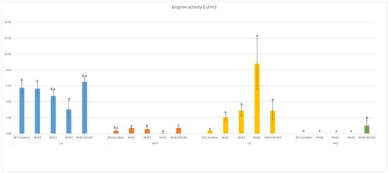 Enzyme activity of Lac, MnP, LiP and VAO in (U/mL), where a, b, and c are homogenoues subsets (from one way ANOVA analysis).