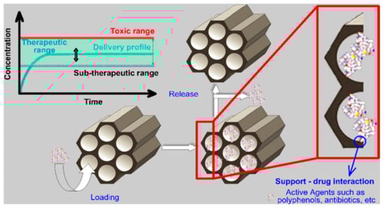 Starting from the advantages of the mesoporous silica supports, innovative drug delivery systems can be developed in order to obtain controlled, targeted drug delivery systems that are able to maintain the therapeutic needs of the BAAs (Figure 1). In this work, several examples of drug delivery systems based on mesoporous silica and different polyphenols will be discussed, highlighting the potential of their use in the treatment of different diseases, and especially, in the treatment of dysbiosis.