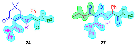 Compounds 20 and 21 can exist in different tautomeric forms, as shown in Figure 3. Experimental and theoretical studies show that the predominant forms in each case are (20c) and (21a) [24]. However, as equilibrium between tautomers is possible, in principle, any of the enolic forms a or b could participate in an enol-Ugi condensation.