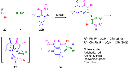 Basing on previous reports, the reaction mechanism must involve the attack of the isocyanide (4) to the protonated imine (22) resulting in a nitrilium ion that is then is attacked by the enolate to give the enol-Ugi primary adduct (23). This then undergoes an intramolecular conjugate addition of the amine nitrogen on the dimedone ring, followed by β-elimination of the imidate oxygen, providing the final adduct (24) (Scheme 2).