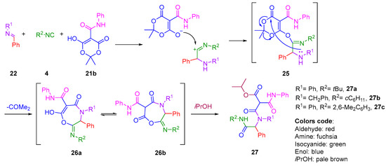 A possible mechanism entails the enol-Ugi reaction between imine (22), tert-butyl-socyanide (4b) and the enolic form (21b) to give the enol-Ugi primary adduct (25). This would rearrange with the loss of acetone to give seven-membered intermediate (26a) that could tautomerize to (26b) and then react with a molecule of isopropanol with the consequent ring opening (Scheme 3). The structure of the resulting product (27a) is compatible with the obtained spectroscopic data.