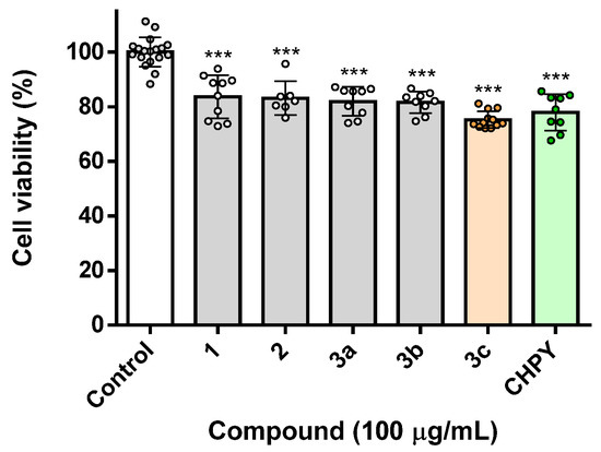 Aiming to evaluate the insecticidal activity of the synthesized eugenol derivatives, Spodoptera frugiperda (Sf9) cells, a common pest, were used. For comparison purposes of their potency, all the molecules under study were screened at the same concentration (100 µg/mL). As can be seen in Figure 1, compounds 3a–c showed similar toxicity towards insect cells, causing ca. 20% of viability loss (equivalent to the commercial insecticide chlorpyrifos).