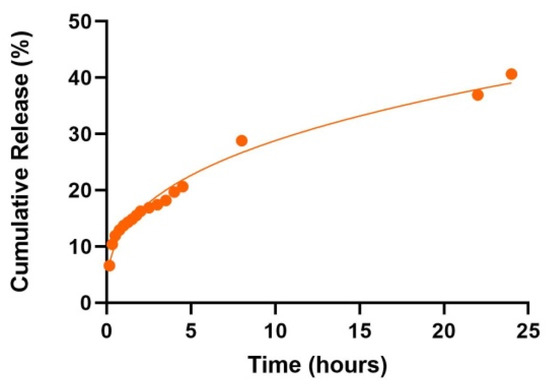 The release profile for 24 h exhibits a delayed release of compound 3c, well fitted to the Korsmeyer–Peppas model [13] (Figure 2). The release constant determined is 12.94 min−1, and the transport exponent is 0.35, indicating a mechanism of Fickian release (diffusion-controlled transport) [12,13].