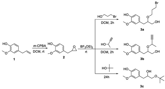 4-Allyl-2-methoxyphenol, eugenol 1, extracted from clove, was used in the efficient synthesis of 2-methoxy-4-(oxiran-2-ylmethyl)phenol 2, by reaction with m-chloroperbenzoic acid (m-CPBA) in DCM following a known procedure [4,7]. Compound 2 was then reacted at room temperature, in the presence of boron trifluoride etherate as Lewis acid, with the corresponding alcohol, namely 3-bromopropan-1-ol, but-3-yn-2-ol, and 2-methylpropan-2-ol. DCM was used as a solvent in the first two cases to give the alkoxy alcohols 3a–c (Scheme 1).