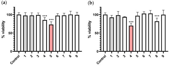 Effect of eugenol and its derivatives (100 μM) in (a) AGS and (b) A549 cell lines. The results correspond to the mean of each well of three independent experiments performed in triplicate. *** p < 0.001.
