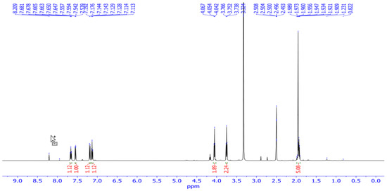 The 1H NMR spectra of the 5a–g compounds showed the resonance signals of all the protons in the molecule, including signals in the δ = 7.66–7.04 ppm region for the aromatic protons (Figure 2). The methylene protons in the alkane chains attached to the nitrogen atoms of the isatin appeared in the region at δ= with δ = 4.05–3.67 ppm for the methylene groups associated with the nitrogen–isatin. The methylene group associated with the azido group had signals located at the upfield, at δ = 3.39–3.36 ppm. The methylene groups in the middle of the alkane chains had chemical shifts in the higher fields (δ = 1.69–1.18 ppm). The alkyl groups attached to the benzene aromatic rings had distinct resonance signals; for example, the 5-methyl group had δ = 2.27 ppm, and the 7-methyl group had δ = 2.48 ppm.