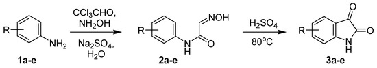 Synthetic route for substituted isatins from corresponding anilines, where, 1a–e,2a–e,3a–e: R = 5-Me, n = 4 (a); 7-Me, n = 4 (b); 5-Et, n = 4 (c); 5-iPr, n = 4 (d); 5-F, n = 3 (e).
