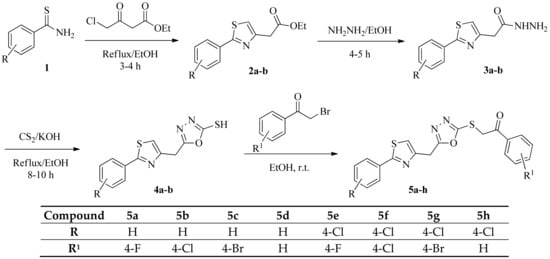 General procedure for the synthesis of 2-(5-(2-arylthiazol-4-yl)methyl)2-thiosubstituted-1,3,4-oxadiazole derivatives (5a–h).