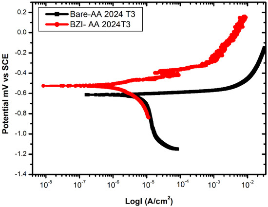 The corrosion and corrosion protection for the bare and treated BZI-AA2024 samples was investigated by potentiodynamic polarisation in the standard NaCl solution, as is shown in Figure 2. The anodic and cathodic behaviour was measured between −250 mV and 750 mV against the tested sample’s open circuit potential (OCP). As shown Figure 2, by using Tafel exploiting, the bare AA2024 sample has a corrosion current of . The anodic branch of the uncoated sample shows the continuous active dissolution of the metal, while the cathodic branch exhibits diffusion control. The corrosion current density (Icorr) of the pre-treated benzimidazole sample BZI-AA2024 is about one order of magnitude lower than the untreated bare-AA2024 sample, with the result at about .
