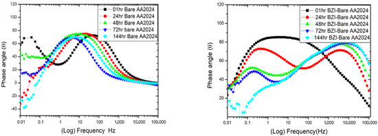 The impedance data for the BZI-AA2024 substrate, as shown in Figure 3, show the EIS results after one hour of immersion-exposed nominal impedance, starting at about , that might be attributed to surface interface solution resistance at high frequencies between 105 and 103 Hz. Then, it starts to rise with slight sloping to reach the higher magnitude in the low frequencies between 1.0 and 0.01 Hz with a value of about , which is higher by two orders of magnitude than the bare-AA2024 sample. However, from 24 h to 144 h, two time constants were observed, the first time constant started between 105 and 103 Hz, and the second began between 10 and 0.1 Hz. These two time constants could be attributed to the integration of BZI film and the aluminium oxide film on the substrate.