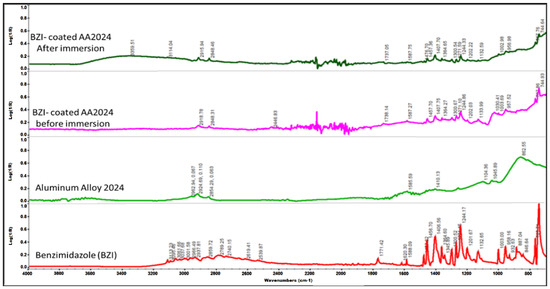 FTIR data confirm the presence of benzimidazole (BZI) film adsorption on the surface of AA2024-T3 substrate before and after immersion. The benzimidazole FTIR is carried out as a control and is presented in Figure 5. Numerous vibration modes are characteristic of the BZI molecule. Additionally, these peaks and stretches can be observed and remain on the BZI-AA2024 sample after treatment. The imine C=N stretching is present at 1588 cm−1, and additional carbon double bond, C=C, stretching peaks are confirmed at 1478 cm−1, 1459 cm−1, and 1410 cm−1, respectively.
