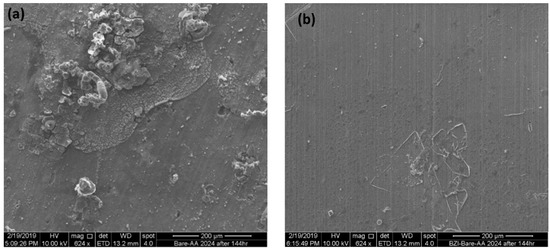Figure 6 shows the surface morphology of both samples, BZI-AA2024 and bare alloy AA. It is clear that the bare sample is attacked by pitting corrosion after long immersion of 144 h, as showed in Figure 6a. On the other hand, the BZI coated sample showed excellent resistance to corrosion under similar circumstances, as seen in Figure 6b. Furthermore, the measurements showed that the Benzimidazole was more stable in the salty water, 3.5% NaCl, which may be attributed the prevention of the diffusion in the coating system, in line with the benzimidazole self-healing-inhibition properties.