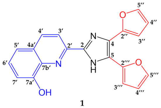 8-Hydroxy-quinoline-2-carbaldehyde (1 mmol), furil (1 mmol), ammonium acetate (20 mmol) and iodine (5 mol%) were dissolved in ethanol (5 mL), followed by stirring and heating at reflux for 4 h. The reaction was monitored by performing a TLC, using DCM/methanol (9:1) as eluent. The reaction mixture was cooled to room temperature, a small amount of solid sodium thiosulfate dissolved in 15 mL of water was added, causing the formation of a precipitate, which was then filtered under vacuum. The crude product was purified by SiO2 column chromatography using DCM/methanol (10:1) to obtain compound 1 (Figure 1).