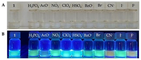 Solutions of compound 1, in ACN/water (75:25), after adding 50 equivalents of anions, under natural light (A) and UV radiation at 365 nm (B).