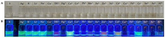 In case of the interaction of compound 1 with cations (Figure 5), no color changes were observed (Figure 5A). With incidence of ultraviolet radiation (Figure 5B), it was observed a quenching of fluorescence of 1 in the presence of Na+, Cu+, Hg2+, Co2+, Pb2+, Ni2+, Cd2+, Cu2+, and Pd2+ ions. There was also a change in λem accompanied by a change from green to red color in the presence of TBT+.