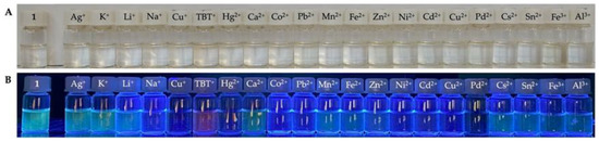 In case of the interaction of compound 1 with cations (Figure 3), no color changes were observed (Figure 3A). With incidence of ultraviolet radiation (Figure 3B), it was observed a quenching of fluorescence for Hg2+, Co2+, Pb2+, Mn2+, Fe2+, Ni2+, Cu2+, Pd2+, Sn2+, Fe3+, and Al3+ ions. There was also a change in λem in the presence of TBT+, Zn2+, and Cd2+ accompanied by a change from green to red color (for TBT+ and Zn2+) and orange (for Cd2+). Finally, it was possible to visualize an enhancement of fluorescence upon the interaction with Ca2+.