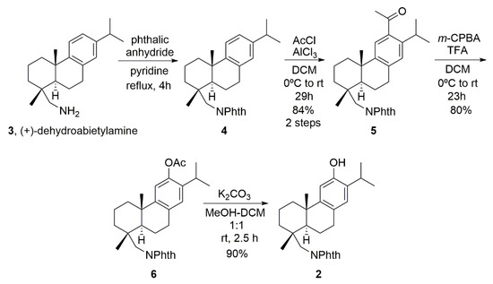 In summary, an optimized synthetic route in multi-gram scale for the preparation of antiviral ferruginol analogue 2 (60% overall yield, four steps), is described. We can conclude that by starting from commercially available (+)-dehydroabietylamine 3 (ca. 60%, Aldrich, 100 g, ca. 100 euro), the sequence can be performed successfully in a cheaper manner than using the more expensive (+)-dehydroabietylamine 3 (>90%, TCI Europe, 100 g, ca. 700 euro). The sequence has been optimized to use only three reaction solvents, pyridine, DCM, and MeOH, and work-up and purification methods, and even the reaction conditions have been modified to overcome some problems found in the original procedure by Malkowsky et al. [7].