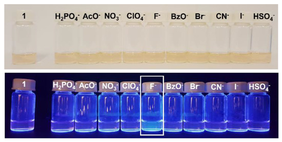 BODIPY derivative 1 solutions in the presence of various anions, in acetonitrile, under natural light (above) and UV radiation at λmax = 365 nm (below).