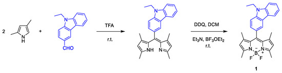 Carbazolyl-BODIPY 1 was synthesized in two reactional steps at room temperature. The first step consisted in the condensation reaction of 2,4-dimethylpyrrole and N-ethylcarbazolyl-4-carbaldehyde in dichloromethane (DCM), in the presence of trifluoroacetic acid (TFA) as catalyst. The second reactional step involved oxidation of the dipyrromethane to dipyrromethene, through addition of a solution of 2,3-dichloro-5,6-diciano-p-benzoquinone (DDQ), followed by a complexation reaction with BF3OEt2 in presence of triethylamine (Scheme 1). Finally, the purification of the crude product by dry flash chromatography, using petroleum ether/ethyl acetate (4:1) as eluent, gave the pure BODIPY derivative 1 as a dark red solid at a 17% yield.