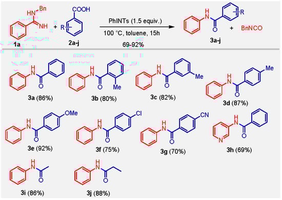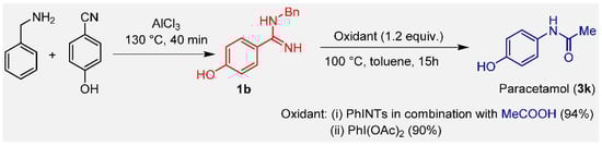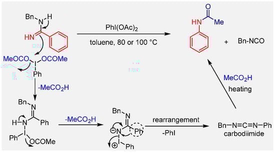 - Debnath, P.; Baeten, M.; LefÀvre, N.; Daele, S.V.; Maes, B.U.W. Synthesis of Secondary Amides from N-Substituted Amidines by Tandem Oxidative Rearrangement and Isocyanate Elimination. Adv. Synth. Catal. 2015, 357, 197–209. [Google Scholar] [CrossRef]