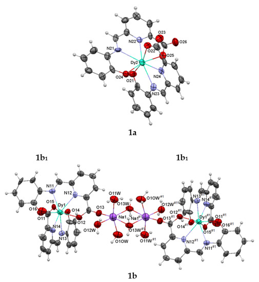 Ellipsoid (50% probability) diagram for the anion [Dy(L)2]− (1a) and the moiety [(DyL)2Na2(H2O)8] (1b) in 1. Water solvate and Et3N+ cations are omitted for clarity.