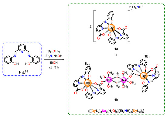 The reaction of the dysprosium(III) triflate with a solution of H2LSB in ethanol and basified with triethylamine and sodium hydroxide leads to the isolation of the complex {[(DyL2)2Na2(H2O)8][Et3NH]2[DyL2]2}·14H2O (1) (Scheme 1).