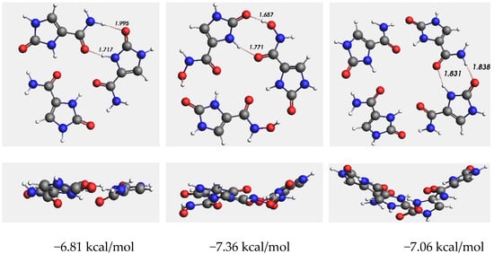 The complex forming capacity of imidazolidinone derivatives was investigated theoretically by high level quantum chemical methods. Density functional calculations with BLYP-D3/TZ2P level of theory was applied and two derivatives, namely the amide and the hydroxamic acid forms were calculated in higher—order structures. The optimized geometrics (top and side views) with important bond distances and average single hydrogen bond energies are presented in Figure 6.