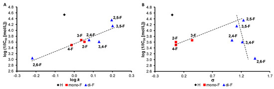 The lipophilicity of all compounds was determined by reversed-phase high performance liquid chromatography (RP-HPLC) and expressed as the logarithm of the capacity factor k; see Table 1. The lowest lipophilicity value (log k = −0.2192) was determined for compound 7 (R = 2,6-F), while the highest lipophilicity was determined for compounds 6 (R = 2,5-F, log k = 0.1954) and 9 (R = 3,5-F, log k = 0.2002). The log k value of unsubstituted derivative 1 was −0.0525. The log k values of the remaining compounds ranged from −0.0155 to 0.1299. Electronic σ(Ar) parameters of individual substituted anilide rings (Table 1) were predicted using the ACD/Percepta ver. 2012 program (Advanced Chemistry Development, Toronto, ON, Canada). Electronic σ parameters ranged from 0 (1, R = H) to 1.44 (7, R = 2,6-F).