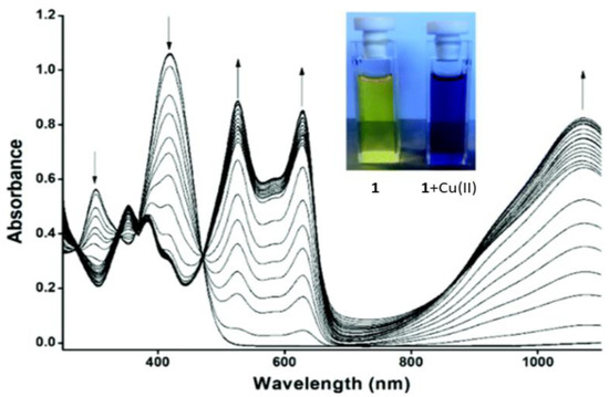 Spectrophotometric titration of compound 1 (5.0 × 10−5 mol L−1) upon addition of increasing amounts of Cu(II) (from 0 to 10 eq.) in acetonitrile, and respective color changes (adapted from [13]).
