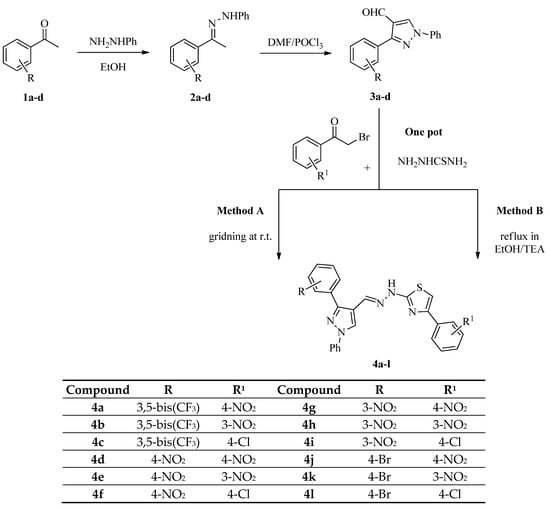 In an extension of our work [32,33,34,35] on the preparation of new products with combinations of dissimilar heterocyclic moieties as possible antimicrobial agents, we report here the synthesis of some new pyrazole derivatives containing thiazole scaffolds. The intermediate pyrazole carbaldehydes 3a–d were synthesized by a known method from the literature [36,37]. A series of pyrazole-containing thiazole derivatives 4a–l (Scheme 1) were synthesized, and all of the synthesized compounds were screened for their antimicrobial activity.