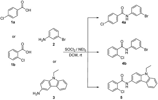 As an attempt to find (semi)synthetic alternative insecticides with high and selective activity to insects but that are nontoxic for human cells and environmentally safe, carboxylic amides 4a, 4b and 5 were prepared (Scheme 1). The reaction of 4-chlorobenzoic acid 1a or 2-chlorobenzoic acid 1b and 3-bromoaniline 2, by a known procedure with thionyl chloride and trimethylamine, under room temperature [40], gave N-(3-bromophenyl)-4-chlorobenzamide 4a and N-(3-bromophenyl)-2-chlorobenzamide 4b. Starting again from 2-chlorobenzoic acid 1b and using 9-ethyl-9H-carbazol-3-amine 3, following the same procedure, 2-chloro-N-(9-ethyl-9H-carbazol-3-yl)benzamide 5 was obtained. All benzamides were isolated in moderate yields, and their structures were confirmed by the usual analytical techniques. The 1H NMR of compounds 4a,b and 5 showed the aromatic protons due to the carboxylic acid units in addition to the amines protons (δ 7.85–8.51 ppm), highlighting the H-3 and H-5 protons of 4-Cl-Ph as double triplets (δ 7.44–7.48 ppm, 4a) and of 2-Cl-Ph as multiplets (δ 7.22–7.47 ppm, 4b, 5), in addition to the H-2 and H-5 protons of 3-Br-Ph as triplets (δ 7.14–7.90 ppm, 4a,b) and of the carbazol nucleus as doublets, double doublets or double triplets (7.22–8.47 ppm, 5). In the 13C NMR, the carbon signal of the amide linkage stands out (δ at about 164.5 ppm).