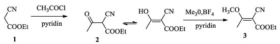 Initially, our attempts to synthesize 2-cyano-3-methoxybut-2-enoate (3) by acylation of ethyl cyanoacetate (1) according to the former literature [16] were unsuccessful. We have obtained a mixture of enol and acetyl derivatives which was methylated by trimethyloxonium fluoroborate into (3) (Scheme 2).