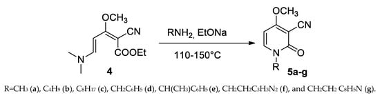 In conclusion, the reaction of primary amines with the ethyl 2-cyano-1-methoxy-5-(dimethylamino)pentadienoate in the presence of sodium ethoxide produced N-derivatives of Ricinine. This reaction constitutes a convenient and versatile synthesis of a variety of N-substituted Ricinine derivatives from commercial primary amines. These compounds are much more available than the alkyl halides sometimes used. The biological properties of the new compounds (5b–5g) are currently being tested.