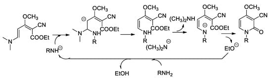 On the other side, the formation of 2-pyridinone by ester-amine cyclization is well documented [19]. We propose the mechanism of formation of the pyridinone cycle by a basic catalysis according to Scheme 6:
