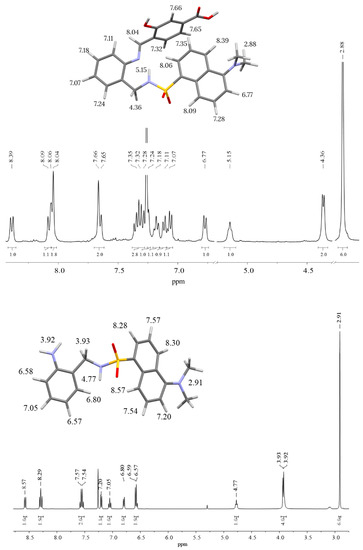 1H-NMR spectra (in chloroform-d) of H3L (top) and N-(2-aminobenzyl)-5-(dimethylamino)naphthalene-1-sulfonamide (bottom), with signal assignment on a 3D model of each molecule.