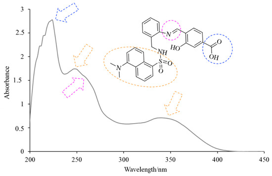 H3L displayed three intense intraligand absorption bands centered at about 225, 250 and 345 nm (Figure 4), corresponding to the π→π* and n→π* transitions of the conjugated system. The absorption band at about 225 nm is in accordance with the presence of the carboxyl group. The observation of two bands with maxima at about 250 and 345 nm evidenced the absorption behavior of the dansyl moiety [10]. The shoulder at about 265 nm can be attributed to the imino group [11] of H3L.