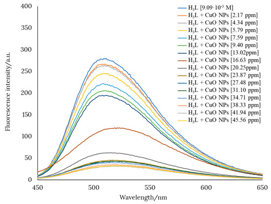 Preliminary studies showed that a pH value of about 12 favors the interaction between H3L and CuO nanomaterials. This was evidenced by a pronounced decrease in the fluorescence intensity of an ethanol solution of H3L when CuO was added in increasing amounts. Figure 6 shows the gradual quenching of the fluorescence intensity of an ethanol solution of H3L after the addition of CuO nanopowder.