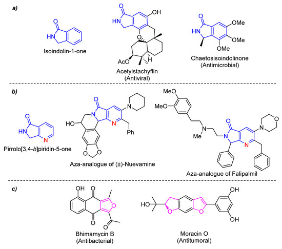 (a) Isoindolin-1-one and related natural products, (b) Pyrrolo[3,4-b]pyridin-5-ones and related bioactive compounds, and (c) Furan-based drugs.