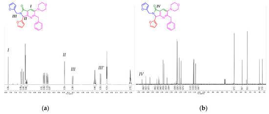 The products 8a-e were characterized by 1H and 13C NMR (see the experimental part for further details). The 2-benzyl-7-(furan-2-yl)-6-(furan-2-ylmethyl)-3-morpholino-6,7-dihydro-5H-pyrrolo[3,4-b]pyridin-5-one (8a) was selected to show its spectrums on behalf of the series 8a-e. With respect to the 1H NMR spectrum, the key signals of pyrrolo[3,4-b]pyridin-5-one nucleus are two singlets, at 7.91 and 5.56 ppm, respectively, corresponding to position 4 of pyridine (I), and methyne (II). The diasterotopic methylene (III) emits also key signals, consisting of two doublets, at 5.22 and 4.06 ppm, respectively (Figure 2a). The difference in their chemical shifts is due to an influence from nitrogen lone pair, and to the stereogenic center (II). Thus, with respect to the 13C NMR spectrum, the key peak is attributed to the carbonyl group (IV) at 166.3 ppm (Figure 2b).
