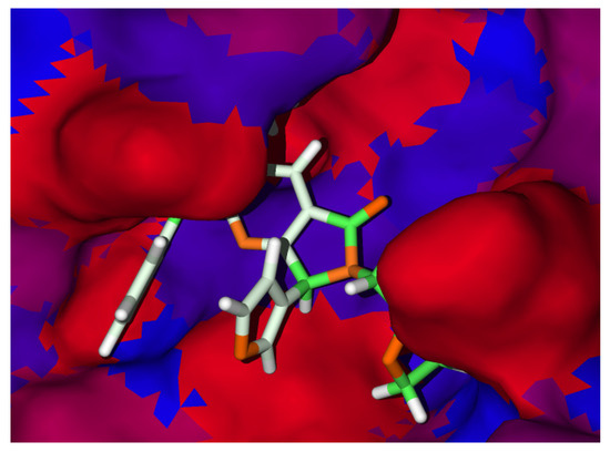 Hydrophobicity surfaces for 8c. Red and blue surfaces represent the hydrophilic and hydrophobic surfaces of the SARS-CoV-2-MPro, respectively. Green and orange sticks are the hydrophilic and hydrophobic moieties of 8c.