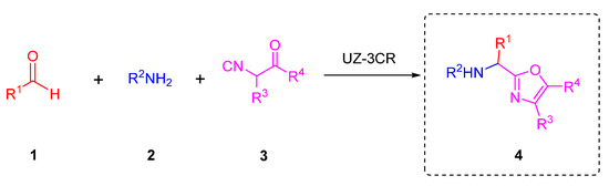 Multicomponent reactions (MCRs) are powerful tools to synthesize quickly and efficiently novel polyheterocyclic compounds. MCRs belong to one-pot process and can be based on the use of isocyanides as principal reagents due to their duality as nucleophiles and electrophiles. MCRs are carried out directly or coupled to further transformations, for instance, ionic, pericyclic, radical-mediated, or metal-catalyzed [14]. Isocyanide-based multicomponent reactions let afford a wide variety of complexes polyheterocyclic whom applied in drug discovery [15]. A classic example that incorporates isocyanides in MCRs is three and four component-Ugi reaction [16]. Within the Ugi-type reactions, it has been recently published a variant of the Ugi reaction that has been studied in our research group called the Ugi-Zhu three-component reaction (UZ-3CR), useful mainly to synthesize 5-aminooxazoles that can act as synthetic platforms toward more complex polyheterocycles. The UZ-3CR involves the combination of aldehydes 1, amines 2, and aminoacid-derived isocyanides 3 in protic or aprotic solvents to assemble just the oxazole core 4. This MCR are eventually promoted by Lewis or BrØnsted acids [17] (Scheme 1).