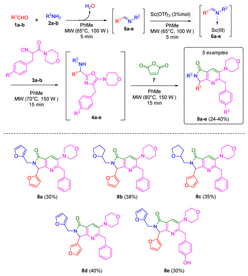 To synthesize the desired bis-furanyl-pyrrolo[3,4-b]pyridin-5-ones 8a-e, the UZ-3CR was coupled to a cascade process: aza-Diels-Alder/N-acylation/aromatization (decarboxylation/dehydration) into a one pot process. The first attempt was carried out under the Zhu’s classic conditions [18], and then optimized in our research group [19,20]. It was found that initially dichloromethane as solvent and scandium triflate as Lewis acid catalyst worked well. However, the solvent used to synthesize all products was toluene due to better solubility observed for all reagents. It was necessary first to synthesize the isocyanides 3 from their corresponding aminoacids in three steps as reported by Zhu and co-workers [18]. With the isocyanide in hands, according to the Ugi-Zhu mechanism, a condensation occurs between aldehydes 1a-b and amines 2a-b to access to imines 5a-e, which become in Lewis’ iminium ions 6a-e after reacting with catalytic amount of scandium(III) triflate. The later intermediates are nucleophilically attacked by the isocyanides 3a-b to give the 5-aminooxazoles 4a-e via a non-prototropic chain-ring tautomerization. Subsequently, after adding maleic anhydride (7), an aza-Diels-Alder cycloaddition coupled into a cascade process N-acylation/aromatization (decarboxylation/dehydration) takes place to generate the corresponding pyrrolo[3,4-b]pyridin-5-ones 8a-e in 24 to 40% yields (Scheme 2). It is worth highlighting the structural complexity of each product, as well as the formation of several new C-C and C-N bonds while leaving only one molecule of water and one of carbon dioxide, which denotes a high atomic economy and a green approach of this synthetic methodology. Also, the use of furan-substituted starting materials for the structural decoration of the pyrrolo [3,4-b] pyridin-5-one nucleus had not been reported yet in the literature.