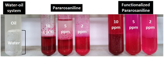 Picture of pararosaniline and functionalized pararosaniline dissolved in a water-oil system at different concentrations.