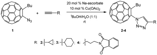 14. Sadretdinova, Z.R.; Akhmetov, A.R.; Tulyabaev, A.R.; Budnikova, Y.H.; Dudkina, Y.B.; Tuktarov, A.R.; Dzhemilev, U.M. Synthesis of fullerenyl-1,2,3-triazoles by reaction of fullerenylazide with terminal acetylenes. Org. Biomol. Chem. 2021, 19, 9299. [Google Scholar] [CrossRef] [PubMed]