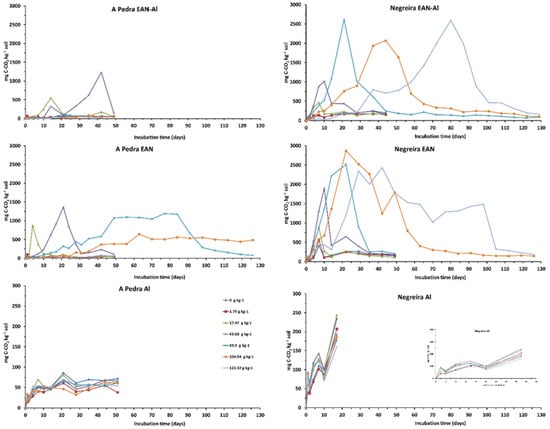 Kinetics of basal respiration in the unspiked A Pedra (left) and Negreira (right) soils and in the same soils spiked with different doses of the saturated mixture of ethylammonium nitrate and aluminium nitrate (EAN-Al) (upper graphs), ethylammonium nitrate (EAN) (middle), or aluminium nitrate (Al(NO3)3) (lower graphs). Note that the limits of the Y axis in A Pedra and Negreira soils spiked with the aluminium salt were lower than in the other cases.