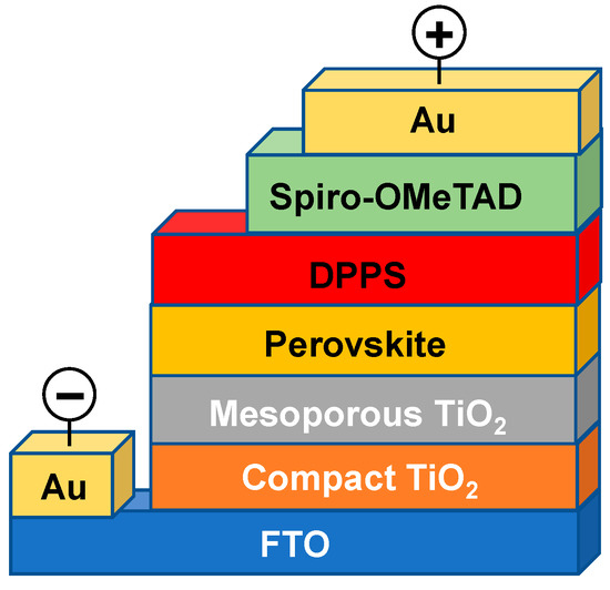 For the preparation of perovskite compounds, a solution of CH3NH3I (190.7 mg) and PbCl2 (111.2 mg) was prepared with a mole ratio of 3:1 and in N,N-dimethylformamide (500 μL) with additives of EABr and RbI. These perovskite solutions were spin-coated three times at 2000 rpm for 60 s [37]. During the third spin-coating, several drops of DPPS were added [38,39,40,41], which is effective for the formation of stable devices [42].