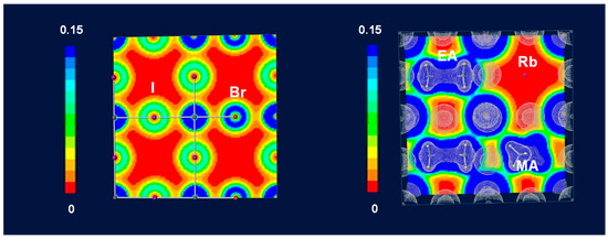 Figure 2 shows the electron density distribution of MA0.625EA0.25Rb0.125PbI2.25Br0.75, showing that the electron density is higher around Br compared with I. It can also be seen that the electrons are delocalized in MA and EA, and there are almost no electrons around Rb.