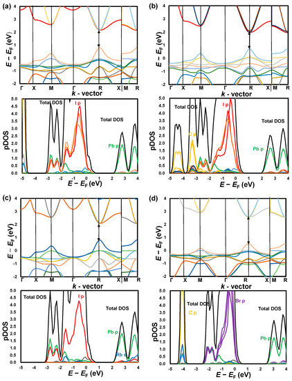 Figure 3 shows the results of band structure and DOS of four types of perovskites. Table 1 also summarizes the results of the effective masses and band gaps of electrons and holes calculated from the band calculations, and the total energies calculated from the first-principles calculations [43,44,45,46,47,48]. All crystals showed a direct transition type. I p orbitals dominate in the valence band and Pb p orbitals in the conduction band, while Rb s orbitals are found at higher energies than Pb b orbitals. The Rb s orbitals were localized at higher energies than the Pb b orbitals, which may contribute to the photovoltaic properties in the short wavelength regions due to optical absorption. The C p orbitals were found to be located far from the band edge. Compared to the MAPbI3, the effective masses of electrons and holes in EAPbI3, RbPbI3, and MAPbBr3 were smaller. The effective masses of electrons and holes became smaller in EAPbI3, RbPbI3 and MAPbBr3 compared to the MAPbI3. The effective masses of electrons and holes are smaller in EAPbI3, RbPbI3, and MAPbBr3 than in MAPbI3, suggesting an increase in carrier mobility. In addition, the band gap of MAPbBr3 was greatly improved. This suggests an increase in the open-circuit voltage. The total energies were found to be stable with the substitution of EA and Br.