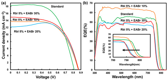Figure 4 and Table 2 shows the current density-voltage (J-V) curves and the external quantum efficiencies. The conversion efficiency was the highest for a standard device. The EQE is almost constant between 300 and 800 nm and shifts to shorter wavelengths with increasing EABr content around 800 nm. This is thought to have led to an increase in the open-circuit voltage by increasing the band gap.