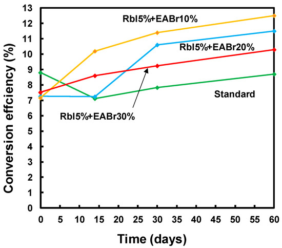 Figure 5 shows the results of conversion efficiencies after 60 days. The conversion efficiencies of the standard device decreased from the initial value, probably due to the decomposition of perovskite by desorption of MA, an organic substance, with time. However, in the doped systems, the conversion efficiencies were improved in all devices. Comparing each parameter, the improvement in JSC and VOC is remarkable. The reason for the improvement in conversion efficiency is thought to be the formation of crystals due to ion diffusion inside the perovskite layer immediately after fabrication. The growth of these crystals by room temperature aging is thought to have improved the surface coverage and the interface between the TiO2 layer and the perovskite layer, resulting in improved conversion efficiency.